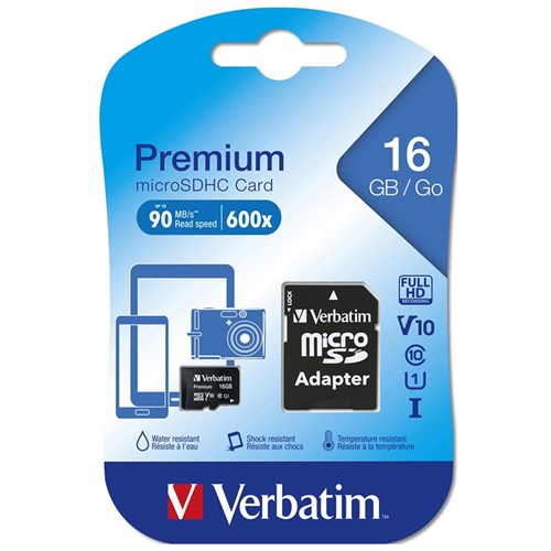 • Verbatim Premium Micro SDHC Memory Card With Adapter Class 16GB Black