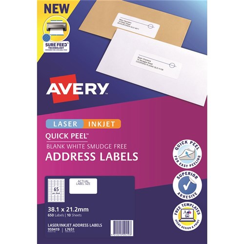 • Avery Quick Peel Address Laser & Inkjet Labels White L7651 38.1 x 21mm 140 Labels