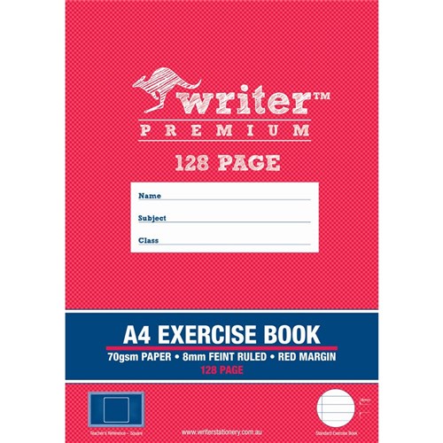 • Writer Premium Exercise Books feature heavy duty covers, high quality white 70gsm paper with blue ruled lines and a red margin