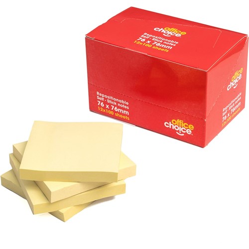 • Office Choice Repositionable Sticky Notes 100 Sheets Yellow 76 x 76mm Pack of 12