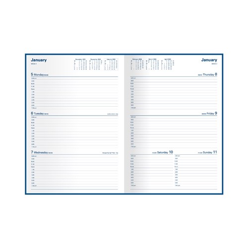 • Lay flat opening, ribbon marker, week to view layout.