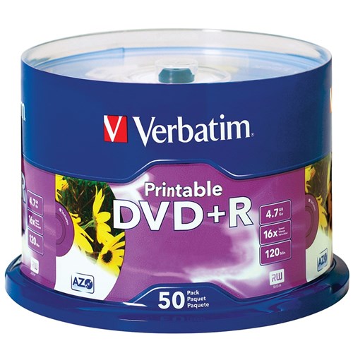 Verbatim Recordable DVD+R 120Min 4.7GB 16X Printable Inkjet Pack Of 50 White