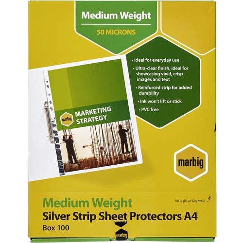 Marbig Sheet Protectors A4 Silver Strip Medium Weight Clear Box Of 100