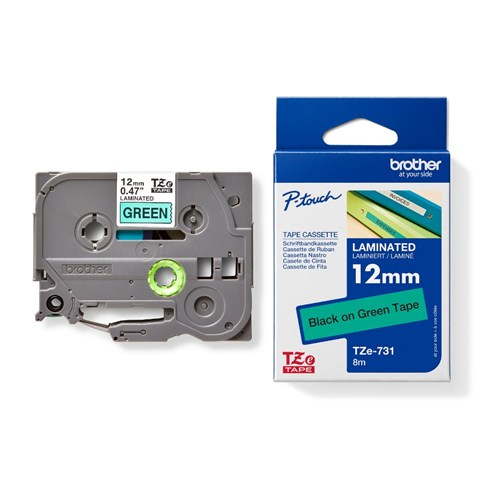 BROTHER TZE731 PTOUCH TAPE 12MMx8M Black on Green Tape