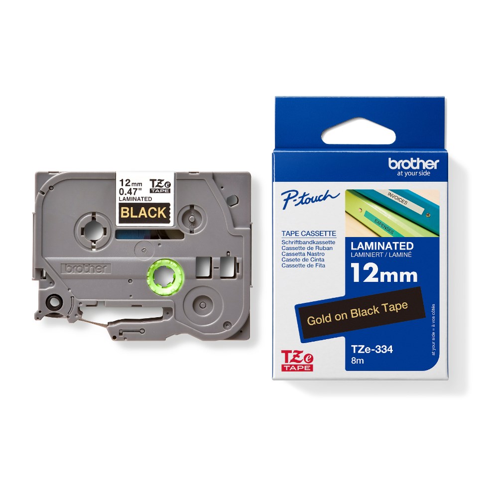 BROTHER TZE334 PTOUCH TAPE 12MMx8M Gold on Black Tape