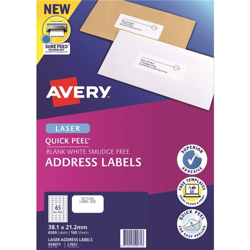 Avery Quick Peel Address Laser White L7651 38.1x21.2mm 65UP 6500 Labels 100 Sheets