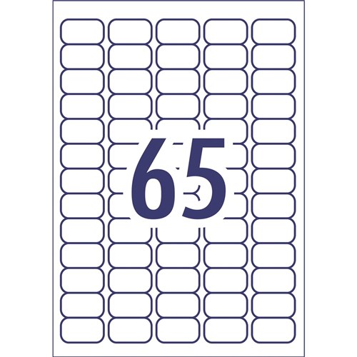 • Size: 38.1x21.2mm 6500 labels, 100 sheets. 65 labels per sheet (65UP).