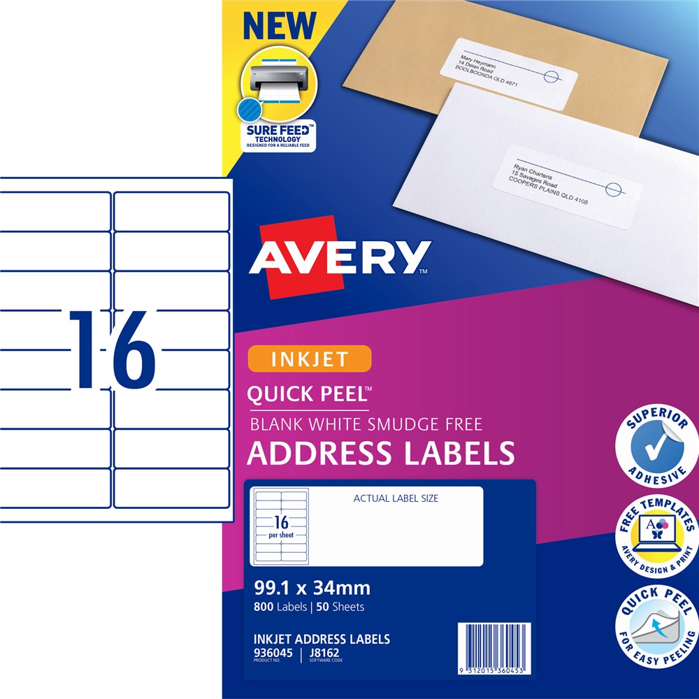 • Ideal for addressing and shipping of letters parcels and boxes FSC certified labels made with paper from well managed forest Inkjet Labels guaranteed Smudge Free™ printing on inkjet printers Supported by free Avery templates available at averyproducts com au/print Size: 99.1x34mm 800 labels, 50 sheets..