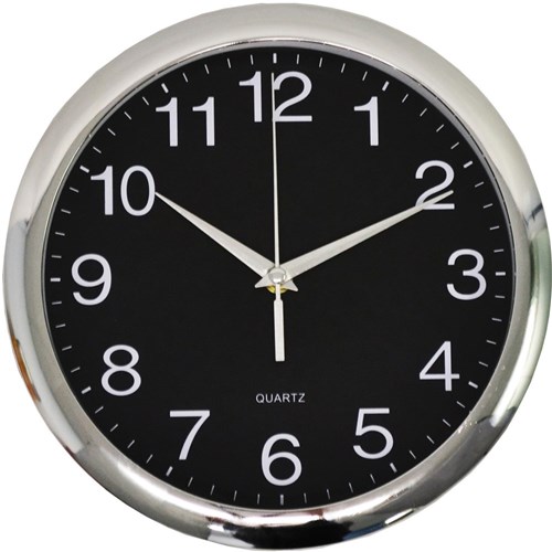 Italplast Wall Clock 30cm Round With Large Numbers Chrome Frame Black Face