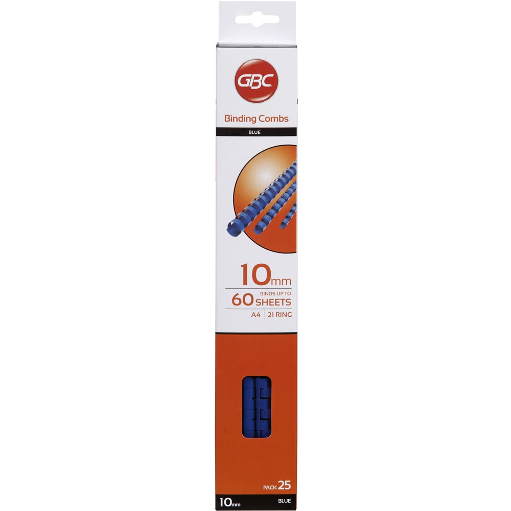 GBC Plastic Binding Comb 10mm 21 Loop 60 Sheets Capacity Blue Pack Of 25