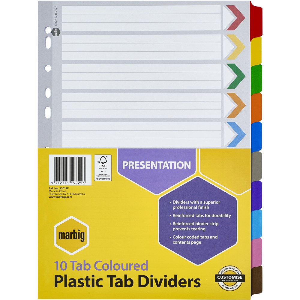 Marbig Plastic Indices & Dividers A4 Reinforced 10 Tab Multi Colour
