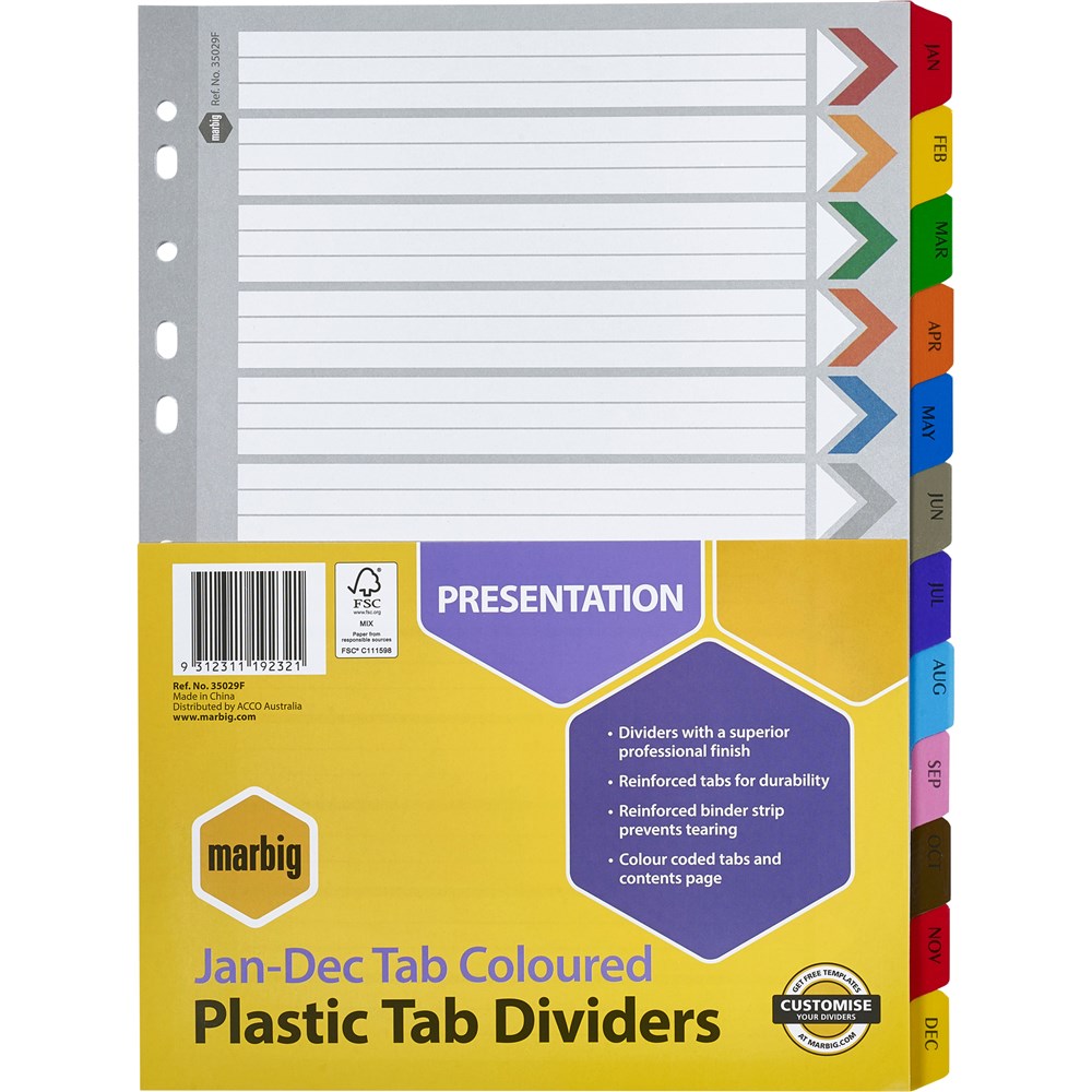 Marbig Plastic Indices & Dividers A4 Reinforced Jan-Dec Tab Multi Colour