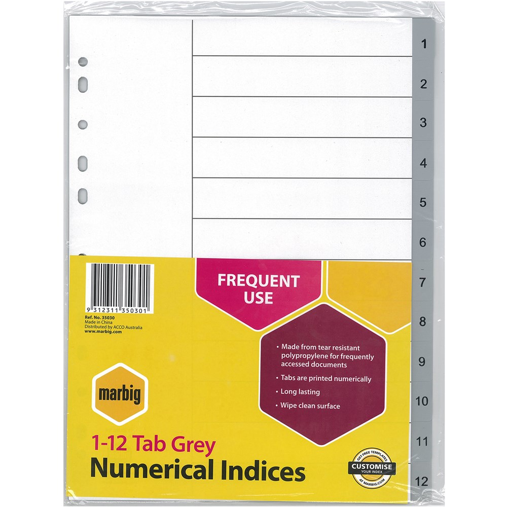Marbig Plastic Indices & Dividers Tabs A4 1-12 Grey 0
